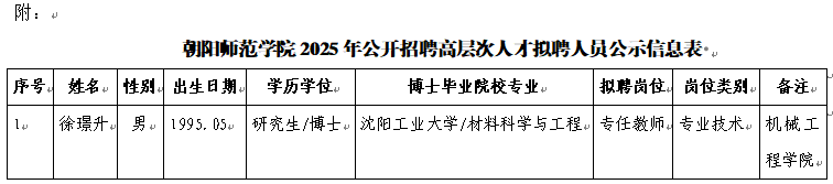 附件:朝阳师范学院2025年公开招聘高层次人员公示信息表