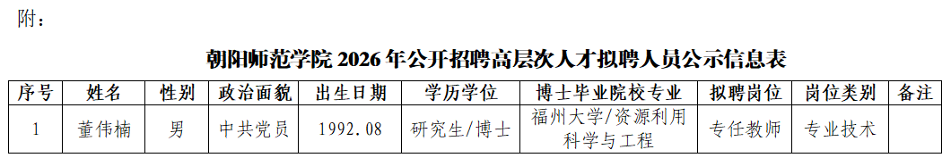 附件:朝阳师范学院2026年公开招聘高层次人才拟聘人员公示信息表