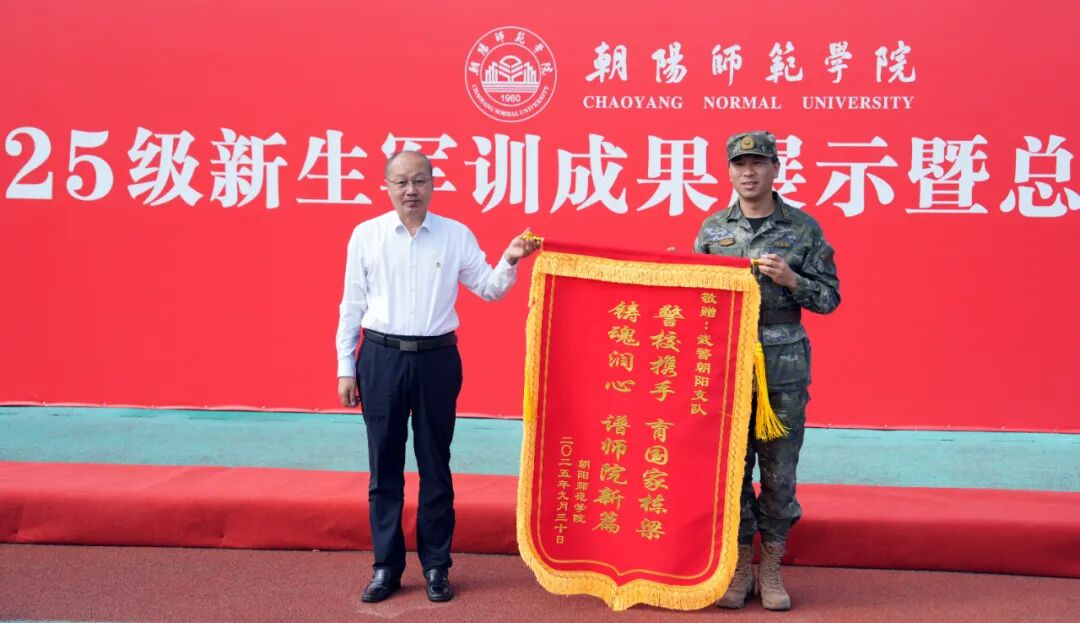 孙士国代表学校向承训部队武警朝阳支队赠送锦旗,感谢武警朝阳支队对军训工作的全力支持与辛勤付出。军训期间,全体承训教官以过硬军事素养、严谨工作作风投入教学,从基础队列指导到夜间徒步拉练,全方位为学生保驾护航。锦旗承载着学校对武警朝阳支队的深深敬意,见证了军民同心的深厚情谊。