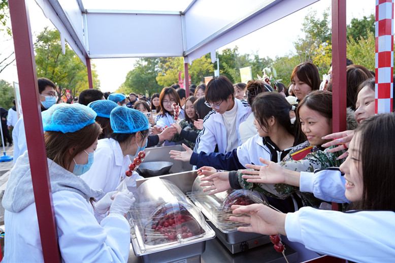各学院紧扣专业优势,将山楂元素与学科知识深度融合,打造出创意满满的展示阵地。文学院在古琴茶香中,以书法作品诠释耕耘与收获的永恒主题;经济与管理学院开展助农直播,以专业能力为乡村振兴注入活力;外国语学院以山楂果、叶拼贴多国语言“丰收”字样,展现自然与人文的和谐;学前教育学院挖掘山楂的形态与色彩特点,将其转化为头环、冰箱贴、花束等充满巧思的创意作品;音乐学院以超轻黏土制作“山楂”文创,让艺术创意在指尖绽放;美术学院将山楂融入非遗技艺,创作出兼具传统韵味与现代审美的艺术作品;数学与信息科学学院用山楂搭建几何模型,解读数学与自然的内在关联;机械工程学院通过机器人精准分拣山楂,勾勒智慧农业未来图景;生物与食品工程学院现场制作冰糖葫芦、山楂糕,成为最受欢迎的“味觉名片”;小学教育学院聚焦“山楂”与“丰收”主题,精心准备并展出系列书法作品,以笔墨传递丰收的喜悦。