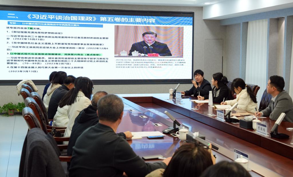 会上,谢晓娟院长作题为《深入学习和领会<习近平谈治国理政>第五卷》主旨报告,谢晓娟围绕《习近平谈治国理政》第五卷的总体结构、主要内容及鲜明特征展开系统解读,重点阐释了“以中国式现代化全面推进中华民族伟大复兴”“因地制宜发展新质生产力”“坚持和加强党中央集中统一领导”等18个专题的核心要义。