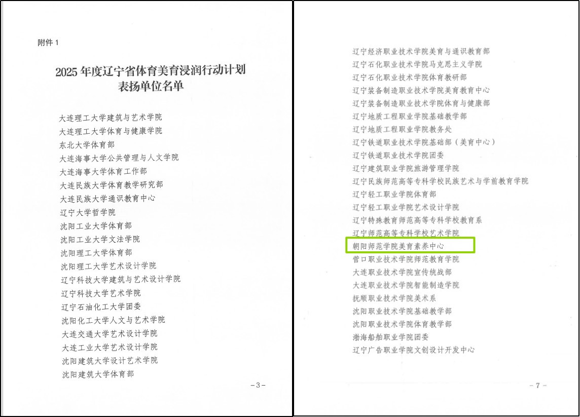 2月6日,辽宁省教育厅下发《关于公布2025年度辽宁省体育美育浸润行动计划表扬名单的通知》(辽教通〔2026〕34号)。我校美育素养中心获批“2025学年辽宁省体育美育浸润行动计划表扬单位”,郝英良、李晓月两位老师被评为“2025年度辽宁省体育美育浸润行动计划表扬教师志愿者”。