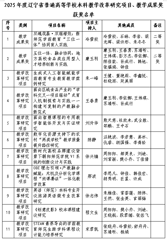 近日,辽宁省教育厅相继发布《关于确定2025年度辽宁省普通高等教育本科教学改革研究项目立项的通知》(辽教通〔2026〕67号)及《关于公布2025年辽宁省普通高等教育本科教学成果展示大赛获奖名单的通知》(辽教通〔2026〕79号),我校9个课题获批省级教学改革研究项目,2个项目获省级本科教学成果奖。
