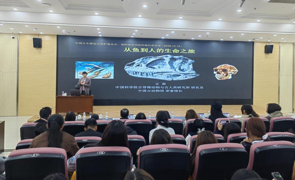 活动中,中国科学院古脊椎动物与古人类研究所研究员、中国古动物馆荣誉馆长王原以《从鱼到人的生命之旅》讲座为钥,开启地球生命长河的探索之旅。他立足科研视角,借古生物化石还原脊椎动物演化脉络,深入解析从脊梁骨起源、颌的出现,到由水登陆、人类诞生等9次关键演化事件,最终引向人类演化终极命题的深度思考,让听众在时空穿梭中读懂生命演化的奇迹与科学的力量。