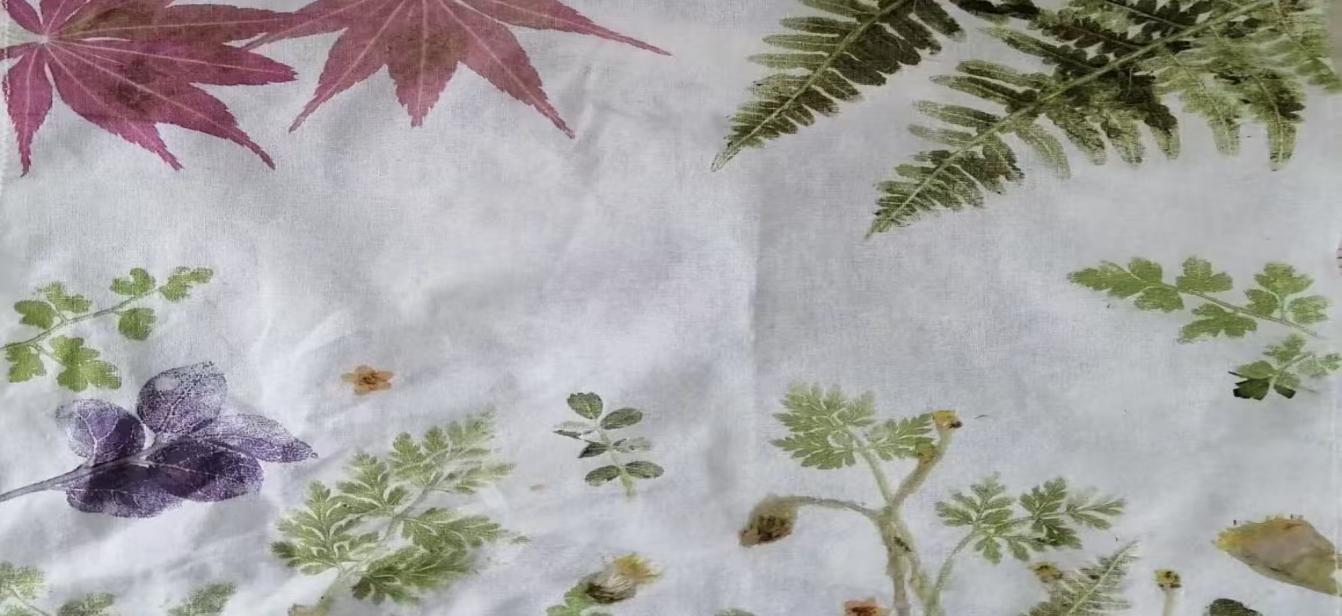 《诗经·小雅·采绿》中“终朝采绿,不盈一匊”,记载了古人采集草木用于染色的场景,植物拓染正是延续了这份“取法自然”的智慧,将草木本色定格留存。成员们以自然花叶为原料,经过选材、清洗、摆放、敲打、定型等步骤,将草木最本真的色彩与纹理永久保留在布料、卡纸上,制成清新自然的书签、装饰小画等作品。