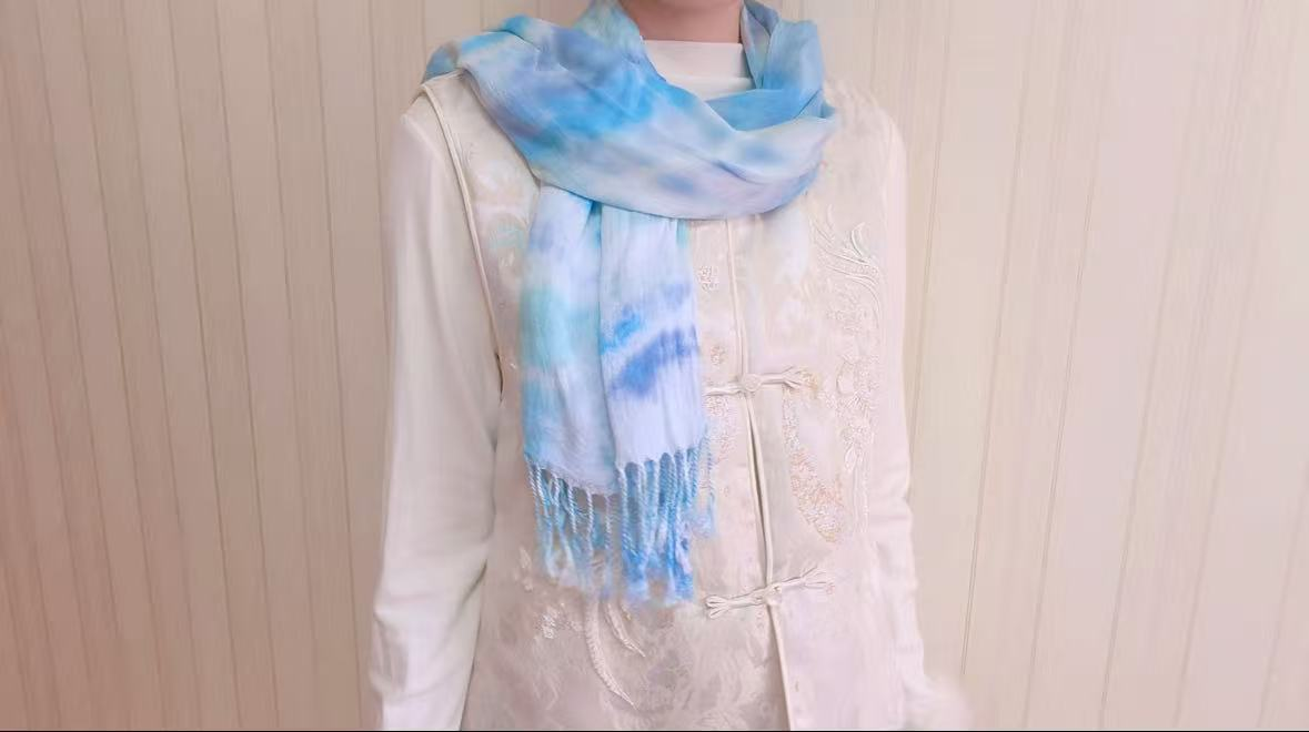扎染古称扎缬,是一门“以绳作笔、以布为纸、以染为墨”的古老技艺,千年以来,这份蓝白相间的雅致从未褪色。队员们采用折叠、捆扎、夹染等传统技法,搭配靛蓝、中国红等节日色调,经浸染、氧化、拆线、清洗、熨烫,最终制作出扎染发圈与扎染围巾,每一件都纹理独特、素雅美观。