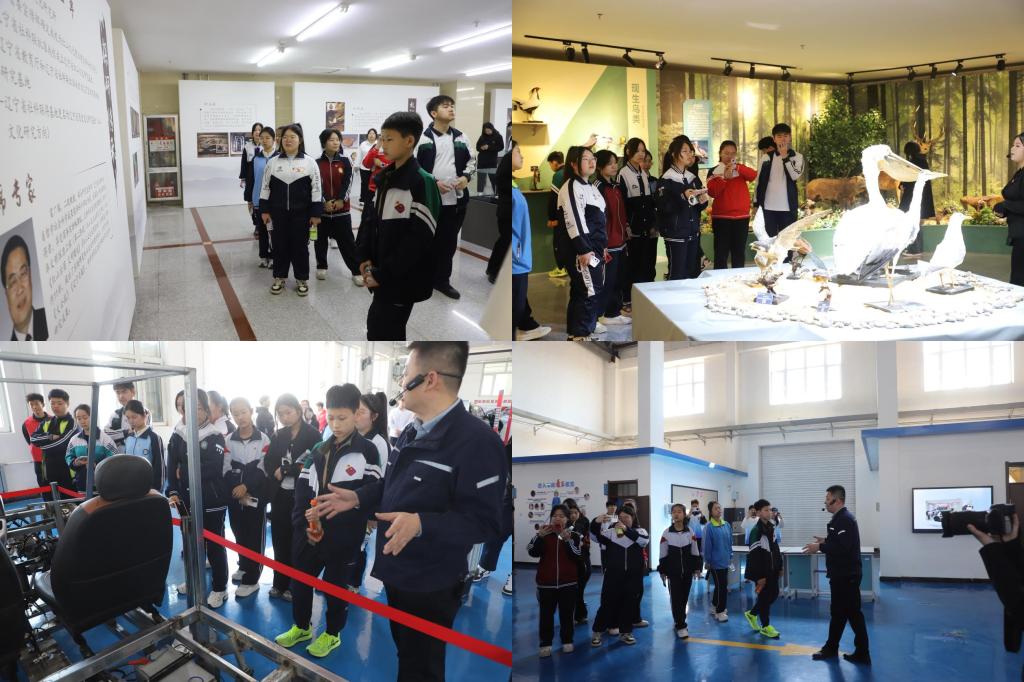 参观团先后走进体育馆、皮影工作室、图书馆、校史馆、红山馆、自然陈列馆、工科实训中心等场所。在皮影工作室,各学校同学们一起参与到精美的皮影道具与经典剧目《雄鹰》的现场演绎中去;图书馆、红山馆与自然陈列馆作为学校特色文化与科普教育阵地,让大家深切体悟辽西本土文化底蕴、沉浸式探索自然奥秘。在工科实训中心,王金圆老师结合实物与现场演示,为同学们详细讲解了传统燃油汽车与新能源汽车在动力结构、工作原理等方面的区别,并系统介绍了机器人智能生产线的运行流程。讲解过程中,同学们不时举手提问,围绕电池技术、智能制造、未来就业等话题与老师深入交流,现场气氛活跃,大家对先进制造技术和汽车产业发展表现出浓厚兴趣。